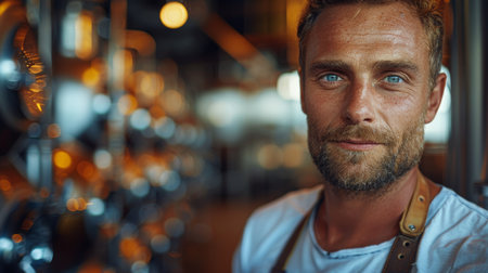Portrait of a confident male worker in a brewery, wearing an apron, with brewing equipment in the background, exuding professionalism and dedication.