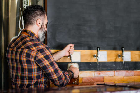 Portrait of barmen at pub. He pours beer into a beer glass. Blank space on table for you text or advert.