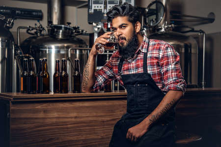 Indian bearded tattooed hipster male manufacturer tasting craft beer in the microbrewery.
