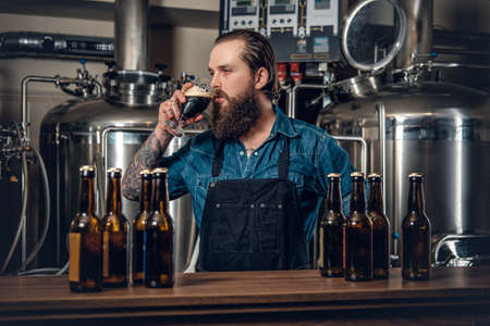 Portrait of tattooed, bearded hipster male manufacturer tasting beer in the microbrewery.