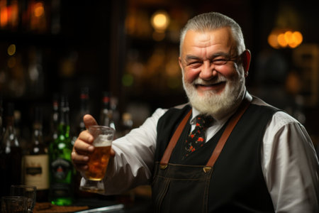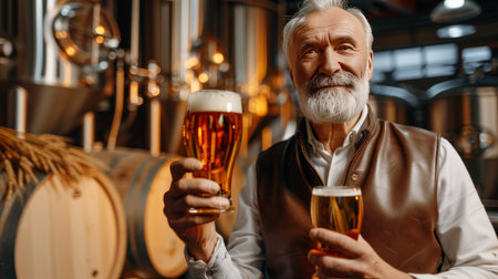 Brewmaster presenting artisan ales for tasting, cozy brewery background, and detailed glassware