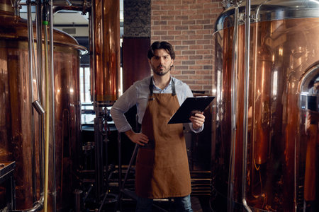 Young male brewer in leather apron supervising the process of beer fermentation at modern brewery factory