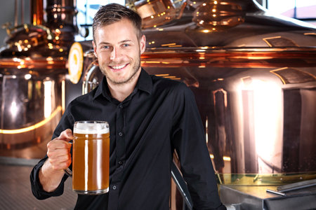Portrait of brewer who is standing with glass of beer on his workplace in brew-house