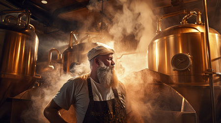 Expert brewer in a modern brewery, meticulously crafting beer with advanced brewing equipment and a focused expression
