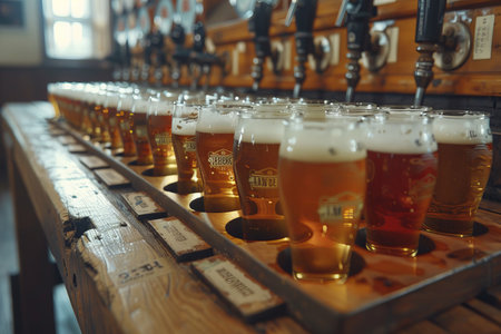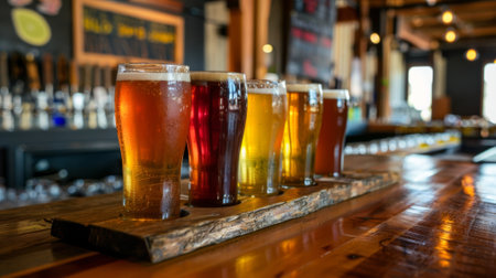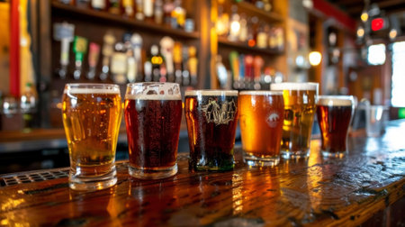 A stunning array of craft beer styles displayed in elegant glasses on a bar. Each glass showcases different colors and textures, inviting appreciation of the brewing artistry.