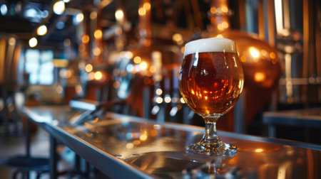 Pint of craft beer with a frothy head, in a brewery with copper tanks