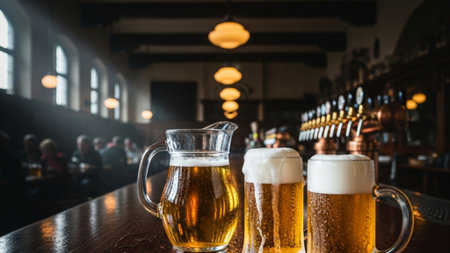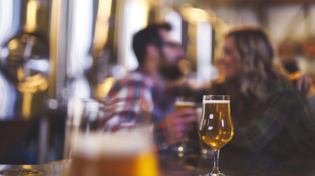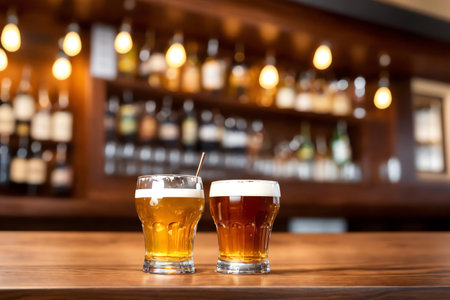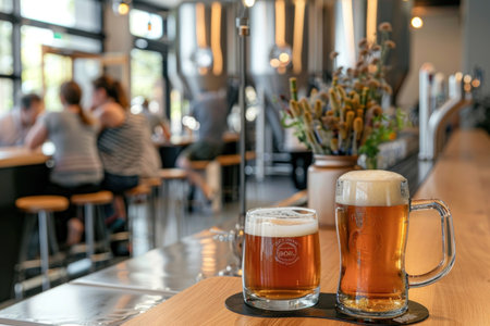 Close-up of two draft beer glasses on a bar counter in a modern brewery. Blurred background with unrecognizable people.