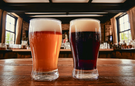 Two glasses of dark and light beer on a wooden table in a pub