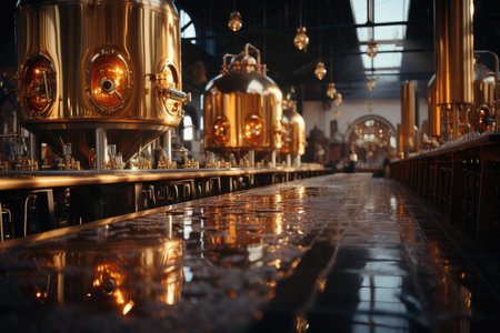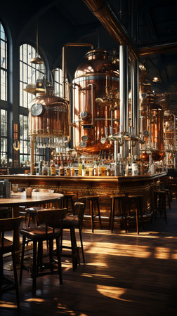 Brewery Interior Scene: Traditional brewery with copper tanks for brewing beer with an integrated bar on its territory.