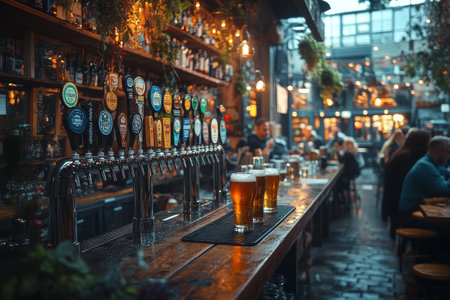 Lively brewery pub happy hour with friends engrossed in conversation and joyful expressions