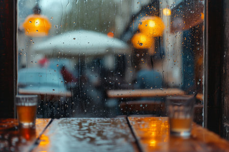 Customers sitting under umbrellas at a restaurant on a rainy day, A cafe view on a rainy day with blurry rain-washed glass, AI Generated