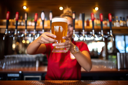 Waitress behind the bar serves beer.