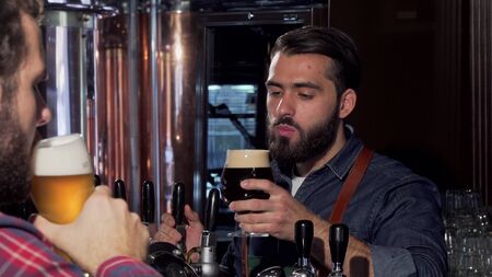 Handsome bearded bartender drinking beer with his customer. Friendly brewer clinking glasses with his client, enjoying tasty beer at the pub. Oktoberfest, brewing, celebration concept