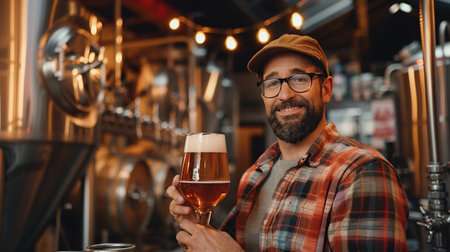 Man holding a glass of craft beer in a brewery or bar, representing a casual drink or tasting experience. copy space.