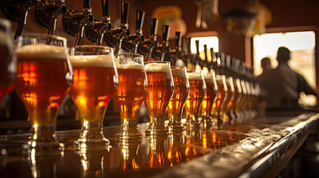 beer taps at a production line filling up glasses, created with generative ai