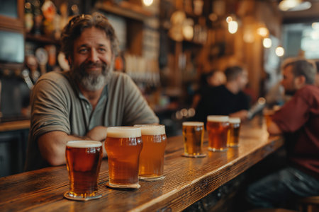 Brewmaster presenting artisan ales for tasting, cozy brewery background, and detailed glassware