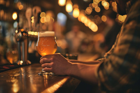 A person is holding a glass of beer in a bar. The atmosphere is casual and relaxed, with people sitting and enjoying their drinks