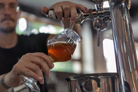 KYIV, UKRAINE - MAY 20, 2018: Bartender pours craft beer during Kyiv Beer Festival vol. 3 in Art Zavod Platforma. About 300 unique varieties of craft beer were presented here.