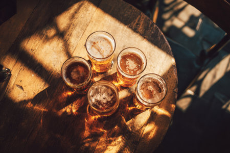 Overhead shot of several beer glasses mid-toast on a wooden table, captured in warm golden-hour lighting, evoking a vibrant social pub atmosphere.