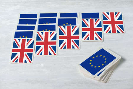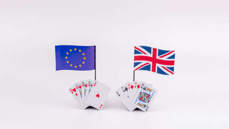 Chess pieces and flags of the European Union and the UK on a chessboard. The concept of the political game and chess strategy Brexit