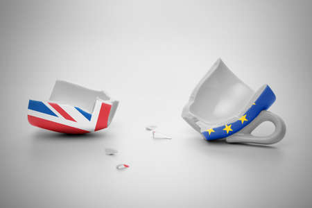 halves of broken European Union and United Kingdom flags cup with few little pieces, concept brexit