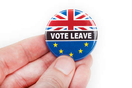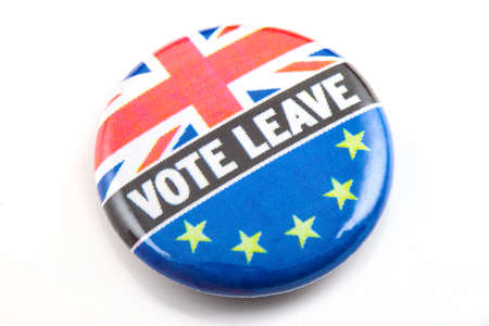 LONDON, UK - MARCH 3RD 2016: A VOTE LEAVE pin badge over a white background, on 3rd March 2016. The badge refers to the upcoming referendum regarding UK’s membership in the European Union.