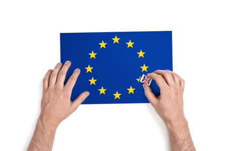 Top view of a man's hands who removes a star from EU flag with UK-styled eraser isolated on the white background. Brexit. British withdrawal. National pride. Patriotism and independence.