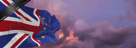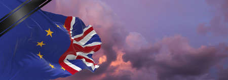 national flag of Union Jack And The Flag Of The European Union with Mourning Ribbon. memory of victims of war, terrorist attack, virus. Black funeral ribbon on flag Honoring memory of victims. 3D illustration.