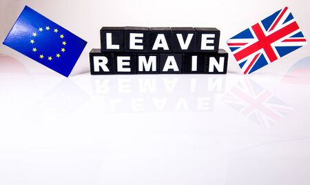 Cube block with alphabets building the word BREXIT on union jack UK flag travel luckage label with white copy space background using as United Kingdom leaving EU European Union concept.