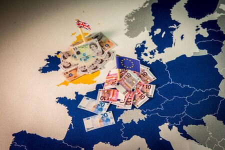 EU and UK flags,euro and pound bills on a european map with EU members in blue.Suitable for a concept of BREXIT,pound against euro,London or Frankfurt economic power,Uk independence or EU membership