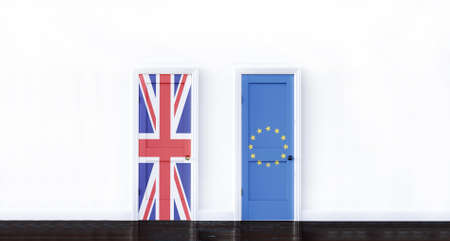 A wide angle shot of two doors with the flags of the UK and the European Union