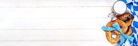 Oktoberfest holiday background, menu mockup. Bavaria flag oktoberfest festival napkin, pretzel, beer bottle and mug on white wooden background, copy space top view
