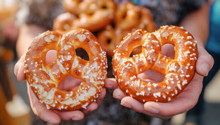 Baker is holding two freshly baked pretzels sprinkled with coarse salt