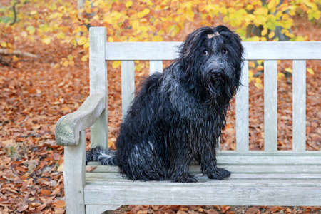 Black mutt dog posing in autumn park.