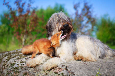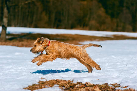 A red puppy briard playing in the park. 3 month's French shepherd is having fun and running commands.
