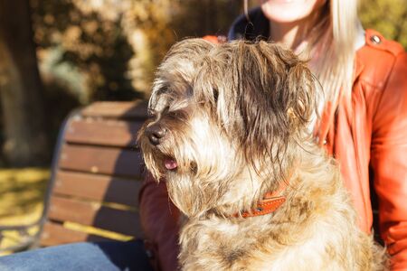 VOLGOGRAD, RUSSIA - November 11, 2016: A muzzle of a fluffy dog against the background of the person, syadishchy on a bench in the park