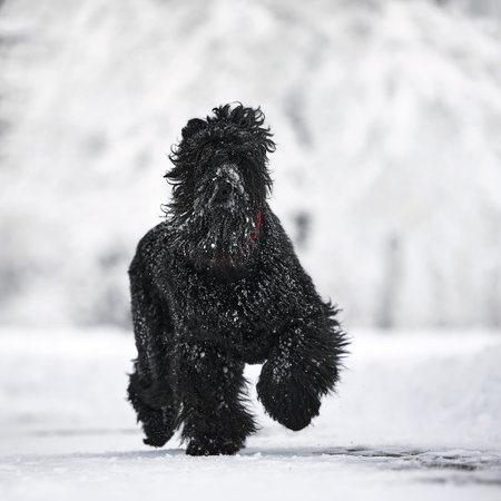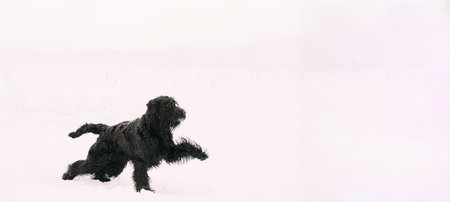 Giant schnauzer dog with black fur running and jumping towards camera in winter with snow in fog weather, Germany