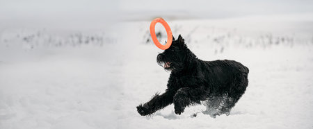 Black Giant Schnauzer Or Riesenschnauzer Dog Playing With Ring Outdoor In Snow, Winter Season. Playful Pet Outdoors.