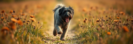 Briard dog standing in meadow field surrounded by vibrant wildflowers and grass on sunny day ai generated
