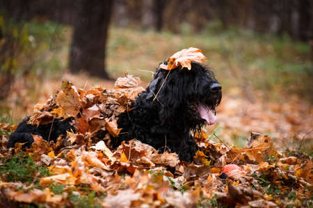 A dog of the Russian Black Terrier breed, a large and formidable dog bred by Soviet breeders, lies on the autumn foliage
