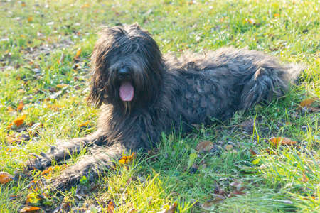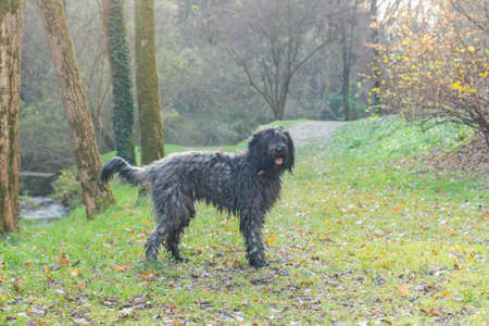 Joyous young female Bergamasco Shepherd dog with black coat is seen on an autumn day outside in a park in northern Italy, Europe.