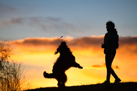 Big dog jumping to take a biscuit from a woman silhouette with background at colorful sunset .