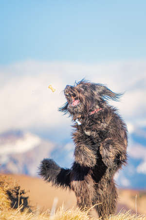A large mountain shepherd dog jumps to catch cookie on the fly