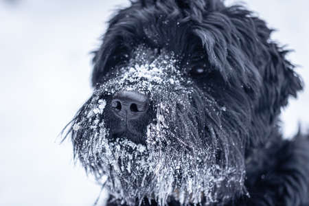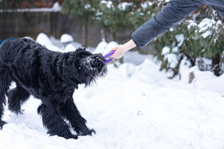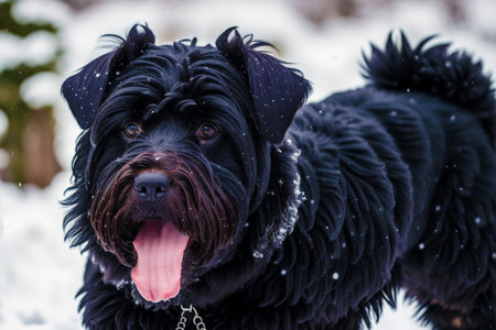 Beautiful black dog Giant Schnauzer on a walk in winter in snowy weather.