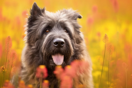 Bouvier des flandres dog sitting in meadow field surrounded by vibrant wildflowers and grass on sunny day ai generated