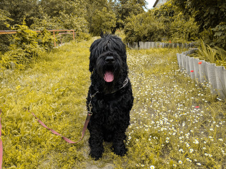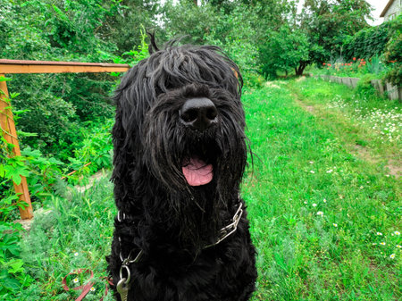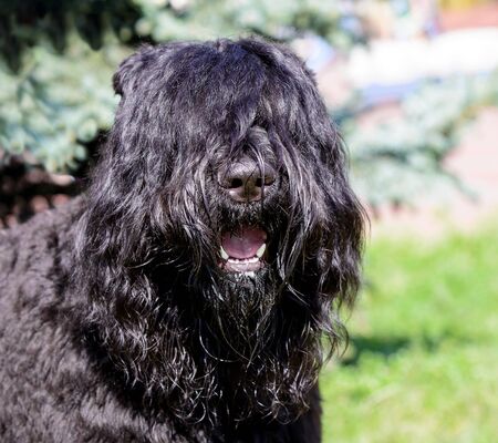 Black Russian Terrier dog close up in the garden