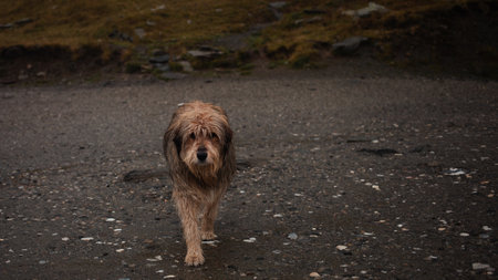 stray lonely dog in mountains, hungry, seeking salvation. Empty space for text, concept of animal protection, do not abandon pets.