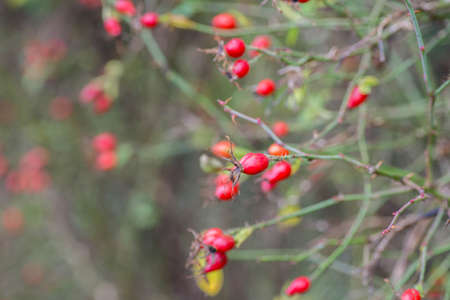 wild rosehips in nature, beautiful background, Red Cankerberry on the Branch of Bush