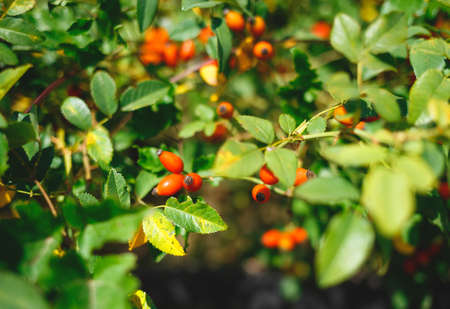 Close up wild rose hips bush in nature with bright wild rose or dog rose berries Red hips with leaves.
