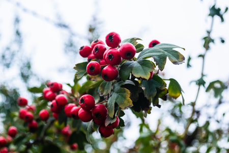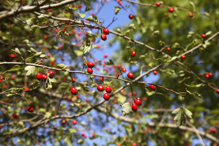Hawthorn red berries grow on a bush.